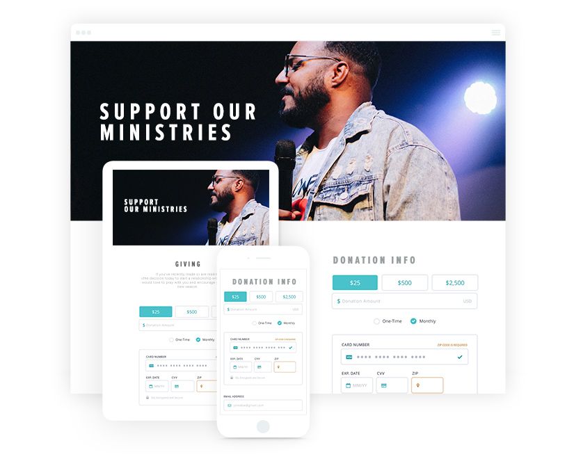 - Customizable payment forms that work on mobile apps and desktop and allow for giving donations via credit cards, ACH transactions, and mobile wallets