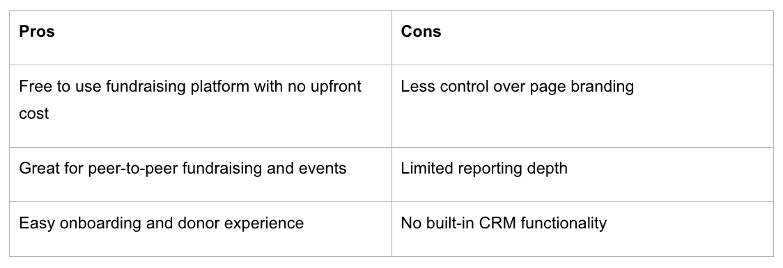 - Advanced features: peer-to-peer, event management, matching gifts, auctions, recurring giving.