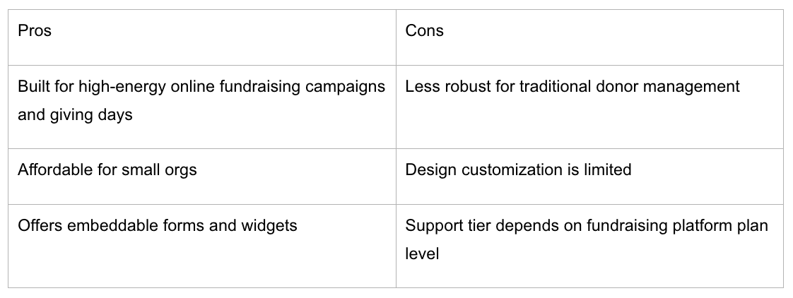 - Strong native one-click integrations (Salesforce, HubSpot, Mailchimp, etc.) so you can automate donor data to CRMs / email tools.