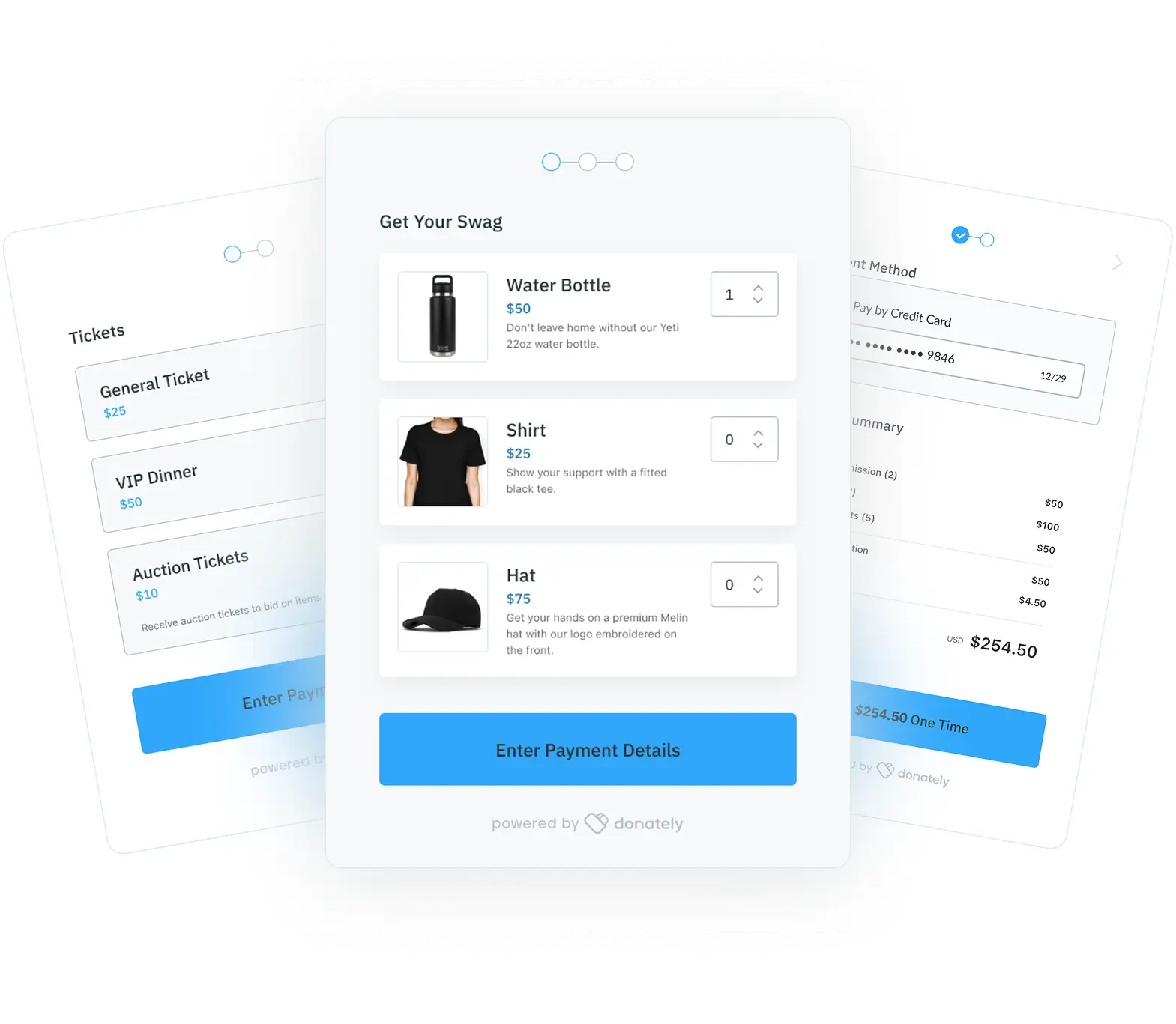 Add tickets, products, memberships, and more — all within the same donation form. With Cart Items, supporters can give, purchase, or register in one simple flow, without leaving your site or juggling multiple tools.
